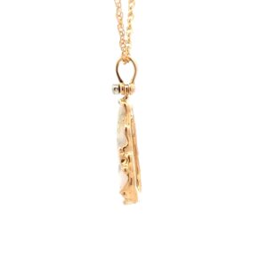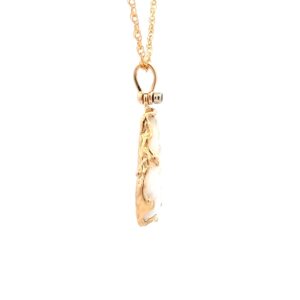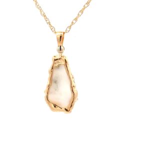 The pendant features a natural gemstone known as “Gold Bearing Quartz,” typically mined from deep underground. In most cases, gold found in quartz exists in microscopic amounts, making it virtually invisible. However, this pendant boasts an extraordinary rarity as it showcases a very scarce stone that is first cut into slabs, revealing the precious gold vein. Subsequently, skilled artisans cut, shape, polish, and mount it into a 14k gold setting. Embrace the allure of this remarkable Gold Bearing Quartz pendant and celebrate the natural beauty of this exceptional gemstone.