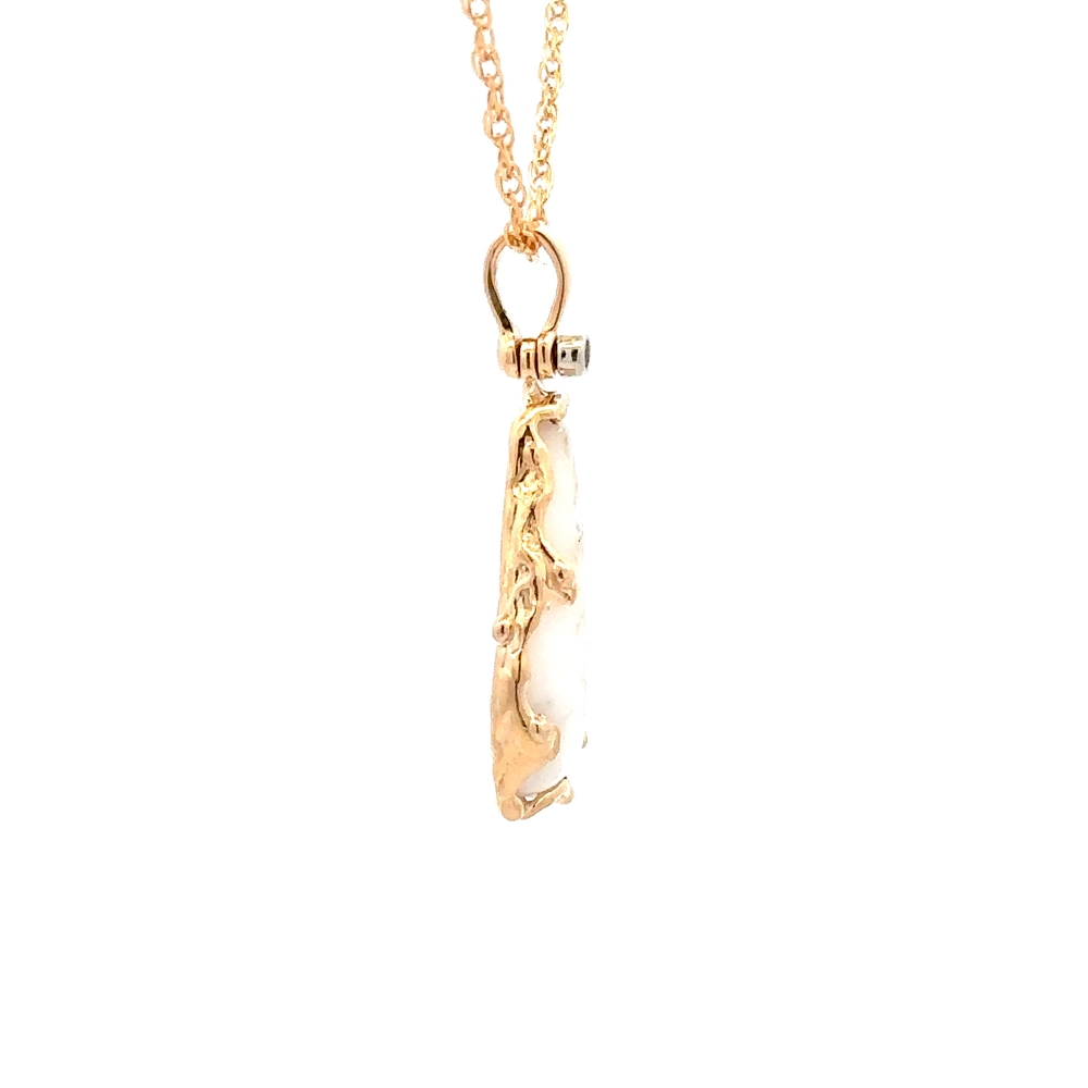 The pendant features a natural gemstone known as “Gold Bearing Quartz,” typically mined from deep underground. In most cases, gold found in quartz exists in microscopic amounts, making it virtually invisible. However, this pendant boasts an extraordinary rarity as it showcases a very scarce stone that is first cut into slabs, revealing the precious gold vein. Subsequently, skilled artisans cut, shape, polish, and mount it into a 14k gold setting. Embrace the allure of this remarkable Gold Bearing Quartz pendant and celebrate the natural beauty of this exceptional gemstone.