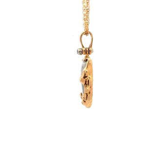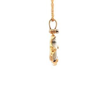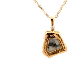 The pendant features a natural gemstone known as “Gold Bearing Quartz,” typically mined from deep underground. In most cases, gold found in quartz exists in microscopic amounts, making it virtually invisible. However, this pendant boasts an extraordinary rarity as it showcases a very scarce stone that is first cut into slabs, revealing the precious gold vein. Subsequently, skilled artisans cut, shape, polish, and mount it into a 14k gold setting. Embrace the allure of this remarkable Gold Bearing Quartz pendant and celebrate the natural beauty of this exceptional gemstone.