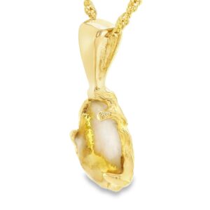 The pendant features a natural gemstone known as “Gold Bearing Quartz,” typically mined from deep underground. In most cases, gold found in quartz exists in microscopic amounts, making it virtually invisible. However, these earrings boast an extraordinary rarity as it showcases a very scarce stone that is first cut into slabs, revealing the precious gold vein. Skilled artisans cut, shape, polish, and mount the gold quartz into a 14k gold setting. Embrace the allure of these remarkable Gold Bearing Quartz earrings and celebrate the natural beauty of this exceptional gemstone.