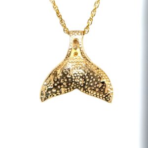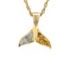 This polished gold quartz & gold nugget whale tail pendant is expertly crafted in 14k gold; the bail is accompanied by a row of diamonds. The necklace comes with a 14k gold-plated chain. The smooth, polished surface brilliantly reflects light, capturing attention from every angle. The photos showcase enlarged details of this exquisite piece. This piece is 3/4ths of an inch tall and/4ths of an inch wide from tail tips.