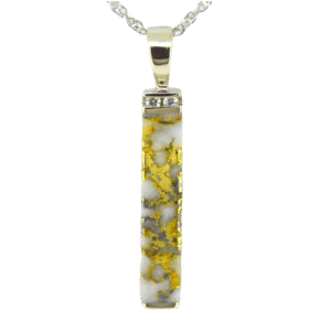 “Gold Bearing Quartz” is a natural gemstone that is usually mined deep underground. Finding snowy white quartz with visible veins of pure gold is extremely difficult. Most of the time, gold mined in quartz is found in microscopic amounts, not at all visible. This very rare stone is cut into slabs, revealing the gold vein, then cut, shaped, polished and mounted into a 14k white gold mounting. Because of the veining of the gold, each piece of jewelry is one of a kind. We make this stone into wonderful pieces for both men and women in rings, bracelets, earrings, cuff links, and anything else you might imagine. We can even design a custom piece for you.