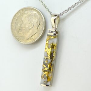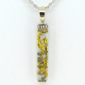 Enhance your look with this gold quartz 14k white gold and diamond pendant. Pendant size is 32×5 mm. Set in 14k white gold setting. Has 2 .03ct diamonds. A base metal chain is included. Photos are enlarged to display detail.