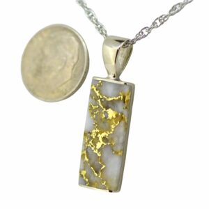 14k white gold pendant. Comes with a base metal chain. Photos are enlarged to display detail. “Gold Bearing Quartz” is a natural gemstone that is usually mined deep underground. Finding snowy white quartz with visible veins of pure gold is extremely difficult. Most of the time, gold mined in quartz is found in microscopic amounts, not at all visible. This very rare stone is cut into slabs, revealing the gold vein, then cut, shaped, polished and mounted into a 14k gold mounting. Because of the veining of the gold, each piece of jewelry is one of a kind. We make this stone into wonderful pieces for both men and women in rings, bracelets, earrings, cuff links, and anything else you might imagine. We can even design a custom piece for you.
