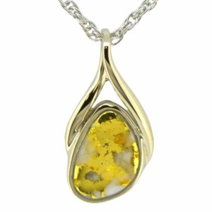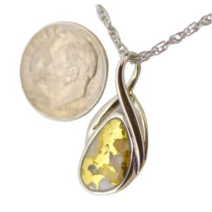 Comes with a base metal chain. Photos are enlarged to display detail. “Gold Bearing Quartz” is a natural gemstone that is usually mined deep underground. Finding snowy white quartz with visible veins of pure gold is extremely difficult. Most of the time, gold mined in quartz is found in microscopic amounts, not at all visible. This very rare stone is then cut into slabs, revealing the gold vein, then cut, shaped, polished and mounted into a 14k white gold mounting. Because of the veining of the gold, each piece of jewelry is one of a kind! We make this stone into wonderful pieces for both men and women, rings, bracelets, earrings, cuff links, and anything else you might imagine. We can even design a custom piece for you.