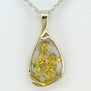 Gold Bearing Quartz is a natural gemstone that is usually mined deep underground. Finding snowy white quartz with visible veins of pure gold is extremely difficult. Most of the time, gold mined in quartz is found in microscopic amounts, not at all visible. This very rare stone is then cut into slabs, revealing the gold vein, then cut, shaped, polished and mounted into a 14k gold mounting. Because of the veining of the gold, each piece of jewelry is one of a kind! We make this stone into wonderful pieces for both men and women, rings, bracelets, earrings, cuff links, and anything else you might imagine. We can even design a custom piece for you. A complimentary base metal chain is included.