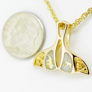 This stunning Gold Quartz 2 Panels & Nugget Whale Tail Pendant is expertly crafted in 14k yellow gold and comes with a 14k gold plated chain. It is almost 1 inch wide and about 3/4 inch tall. The smooth, polished surface brilliantly reflects light, capturing attention from every angle. The photos and video showcase enlarged details of this beautiful piece.
