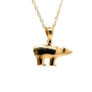 This is a bear shaped pendant made of gold quartz, set in a closed back 14k yellow gold setting with an accent diamond. The bear is about an inch across. It comes with a 14k gold plated chain. The smooth, polished surface brilliantly reflects light, capturing attention from every angle. The photos showcase enlarged details of this beautiful piece.