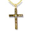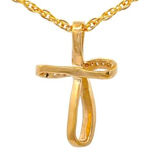 This unique gold quartz cross pendant is expertly crafted in 14k yellow gold and comes with an 18”, 14k gold-filled chain. The setting is 26 mm tall and 18 mm wide. There are .12ct diamonds- SI 1, Color GHI.