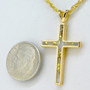 This beautiful gold quartz cross pendant is expertly crafted in 14k yellow gold and comes with an 18-inch, 14k gold-filled chain. The smooth, polished surface brilliantly reflects light, capturing attention from every angle. The photos and video showcase enlarged details of this beautiful piece. This piece is a little less than an inch and a half tall.