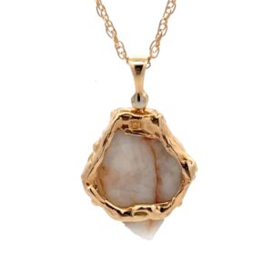 “Gold-bearing quartz” is a natural gemstone that is usually mined deep underground. Finding snowy white quartz with visible veins of pure gold is extremely difficult. Most of the time, gold mined in quartz is found in microscopic amounts, not at all visible. This very rare stone is then cut into slabs, revealing the gold vein, and then cut, shaped, polished, and mounted.