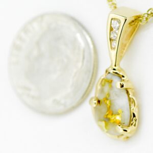 Check out this beautiful gold quartz & diamond pendant. Comes with 14k gold-filled chain. Chain shown in photo not included. Photos are enlarged to display detail.