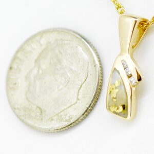 This beautiful gold quartz and diamond pendant features a piece of gold bearing quartz found several thousand feet below the surface of the earth. The mounting is 14k gold and the veins of gold in the quartz are very close to pure gold. Each piece of jewelry we make from this gemstone are one of a kind due to the patterns of the veining. This pendant comes wiith a complimentary gold filled chain and packaged in a gift box. We have many gold chains available as well. Please call for chain options.