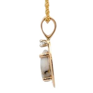 “Gold Bearing Quartz” is a natural gemstone that is usually mined deep underground. Finding snowy white quartz with visible veins of pure gold is extremely difficult. Most of the time, gold mined in quartz is found in microscopic amounts, not at all visible. This very rare stone is cut into slabs, revealing the gold vein, then cut, shaped, polished, and mounted into a 14k gold mounting. Because of the veining of the gold, each piece of jewelry is one of a kind! We make this stone into wonderful pieces for both men and women, rings, bracelets, earrings, cuff links, and anything else you might imagine. We can even design a custom piece for you. This pendant comes wiith a complimentary gold-filled chain and packaged in a gift box. We have many gold chains available as well. Please call for chain options.