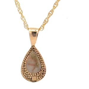 This beautiful gold quartz pendant comes with a 14k gold-filled chain & is mounted in a 14k gold setting. This piece features 5 inlaid diamonds. This piece is an inch tall.