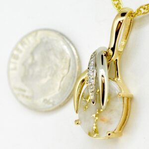 The pendant features a natural gemstone known as “Gold Bearing Quartz,” typically mined from deep underground. In most cases, gold found in quartz exists in microscopic amounts, making it virtually invisible. However, this pendant boasts an extraordinary rarity as it showcases a very scarce stone that is first cut into slabs, revealing the precious gold vein. Subsequently, skilled artisans cut, shape, polish, and mount it into a 14k gold setting. Embrace the allure of this remarkable Gold Bearing Quartz pendant and celebrate the natural beauty of this exceptional gemstone.