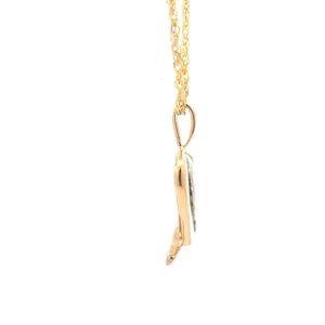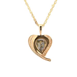 The pendant features a natural gemstone known as “Gold Bearing Quartz,” typically mined from deep underground. In most cases, gold found in quartz exists in microscopic amounts, making it virtually invisible. However, this pendant boasts an extraordinary rarity as it showcases a very scarce stone that is first cut into slabs, revealing the precious gold vein. Subsequently, skilled artisans cut, shape, polish, and mount it into a 14k gold setting. Embrace the allure of this remarkable Gold Bearing Quartz pendant and celebrate the natural beauty of this exceptional gemstone.