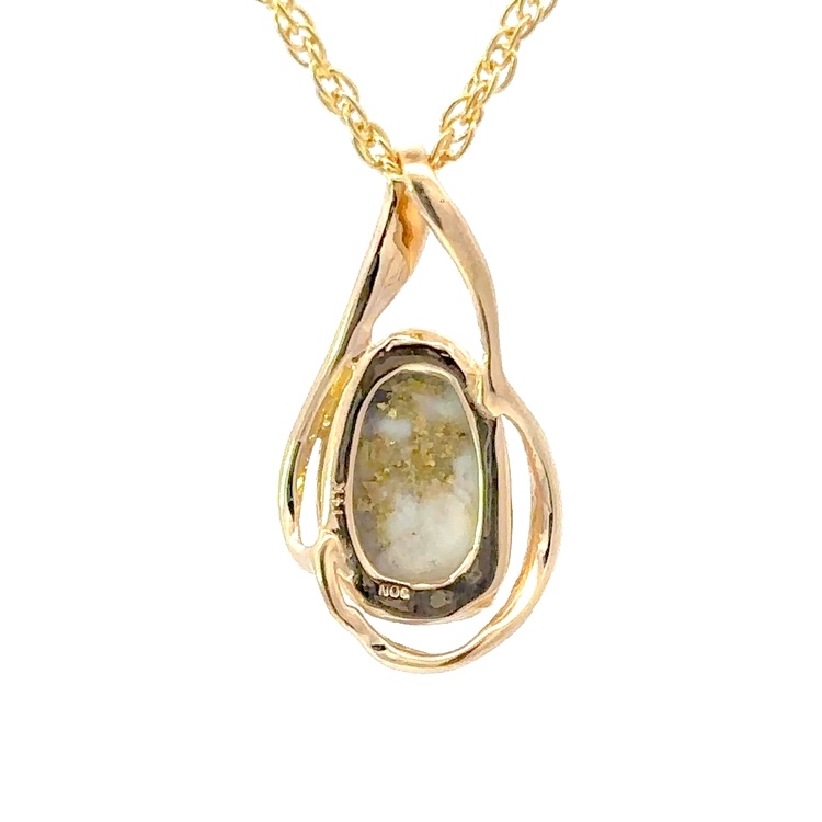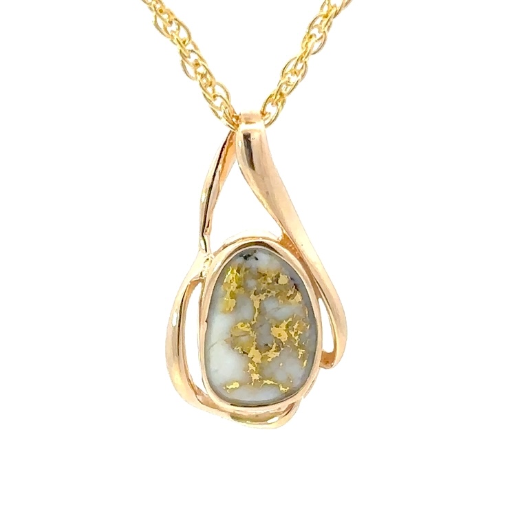 “Gold-bearing quartz” is a natural gemstone that is usually mined deep underground. Finding snowy white quartz with visible veins of pure gold is extremely difficult. Most of the time, gold mined in quartz is found in microscopic amounts, not at all visible. This very rare stone is then cut into slabs, revealing the gold vein, and then cut, shaped, polished, and mounted.