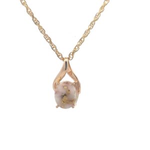 The pendant features a natural gemstone known as “Gold Bearing Quartz,” typically mined from deep underground. In most cases, gold found in quartz exists in microscopic amounts, making it virtually invisible. However, this pendant boasts an extraordinary rarity as it showcases a very scarce stone that is first cut into slabs, revealing the precious gold vein. Subsequently, skilled artisans cut, shape, polish, and mount it into a 14k gold setting. Embrace the allure of this remarkable Gold Bearing Quartz pendant and celebrate the natural beauty of this exceptional gemstone.