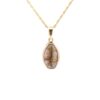 This is an oval-shaped pendant made of gold quartz along with accent diamonds set in a 14k yellow gold setting, and comes with a 14k gold-plated chain. The smooth, polished surface brilliantly reflects light, capturing attention from every angle. The photos showcase enlarged details of this beautiful piece. This piece is about an inch.