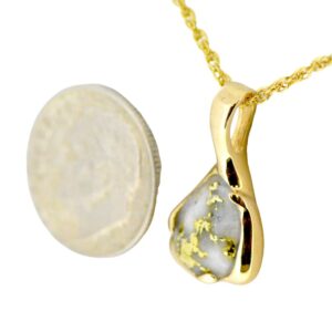 “Gold-bearing quartz” is a natural gemstone that is usually mined deep underground. Finding snowy white quartz with visible veins of pure gold is extremely difficult. Most of the time, gold mined in quartz is found in microscopic amounts, not at all visible. This very rare stone is cut into slabs, revealing the gold vein, then cut, shaped, polished, and mounted into a 14k gold mounting. Because of the veining of the gold, each piece of jewelry is one of a kind. We make this stone into wonderful pieces for both men and women in rings, bracelets, earrings, cuff links, and anything else you might imagine. We can even design a custom piece for you.