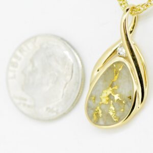 Enhance your look with this gold quartz and diamond pendant. Quartz stone size is 13×9 mm. A diamond is set at the top of the quartz stone. Comes with a 14k gold-filled chain. Chain shown in photo not included. Photos are enlarged to display detail. The whole piece measures approximately an inch tall.