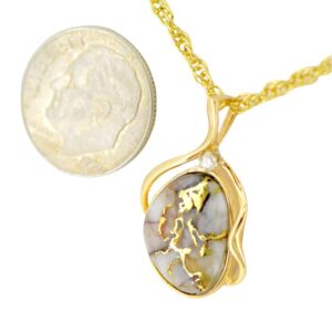 14k gold pendant. Comes with 14k gold plated chain. Photos are enlarged to display detail. “Gold Bearing Quartz” is a natural gemstone that is usually mined deep underground. Finding snowy white quartz with visible veins of pure gold is extremely difficult. Most of the time, gold mined in quartz is found in microscopic amounts, not at all visible. This very rare stone is cut into slabs, revealing the gold vein, then cut, shaped, polished and mounted into a 14k gold mounting. Because of the veining of the gold, each piece of jewelry is one of a kind. We make this stone into wonderful pieces for both men and women in rings, bracelets, earrings, cuff links, and anything else you might imagine. We can even design a custom piece for you.