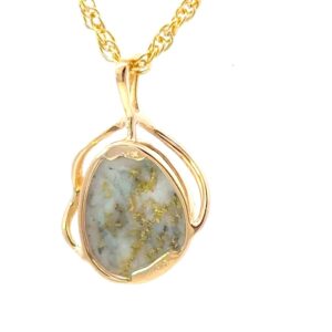 “Gold-bearing quartz” is a natural gemstone that is usually mined deep underground. Finding snowy white quartz with visible veins of pure gold is extremely difficult. Most of the time, gold mined in quartz is found in microscopic amounts, not at all visible. This very rare stone is then cut into slabs, revealing the gold vein, and then cut, shaped, polished, and mounted.