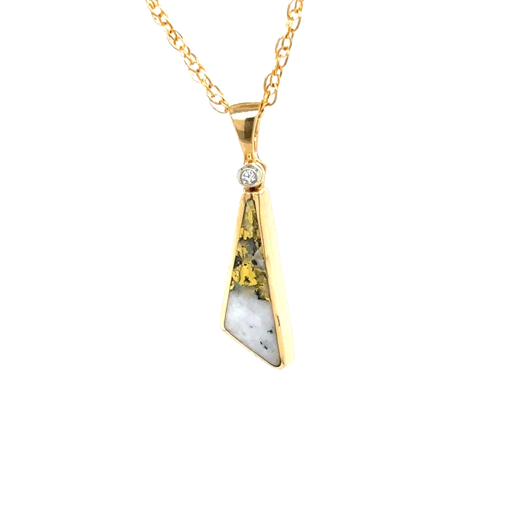 “Gold Bearing Quartz” is a natural gemstone that is usually mined deep underground. Finding snowy white quartz with visible veins of pure gold is extremely difficult. Most of the time, gold mined in quartz is found in microscopic amounts, not at all visible. This very rare stone is cut into slabs, revealing the gold vein, then cut, shaped, polished and mounted into a 14k gold mounting. Because of the veining of the gold, each piece of jewelry is one of a kind! We make this stone into wonderful pieces for both men and women in rings, bracelets, earrings, cuff links, and anything else you might imagine.
