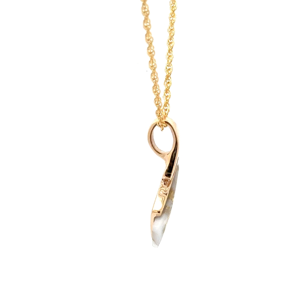 The pendant features a natural gemstone known as “Gold Bearing Quartz,” typically mined from deep underground. In most cases, gold found in quartz exists in microscopic amounts, making it virtually invisible. However, this pendant boasts an extraordinary rarity as it showcases a very scarce stone that is first cut into slabs, revealing the precious gold vein. Subsequently, skilled artisans cut, shape, polish, and mount it into a 14k gold setting. Embrace the allure of this remarkable Gold Bearing Quartz pendant and celebrate the natural beauty of this exceptional gemstone.