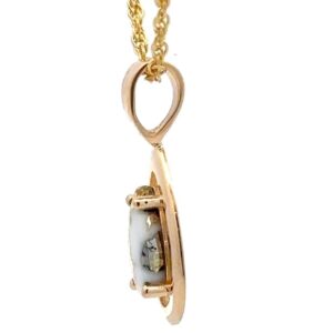 This gold quartz pendant is mounted in 14k yellow gold and comes with a 14k gold-filled chain. Photos are enlarged to display detail. This piece is 7/8ths of an inch tall.