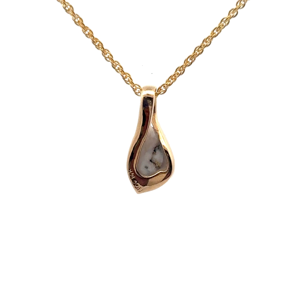 The pendant features a natural gemstone known as “Gold Bearing Quartz,” typically mined from deep underground. In most cases, gold found in quartz exists in microscopic amounts, making it virtually invisible. However, this pendant boasts an extraordinary rarity as it showcases a very scarce stone that is first cut into slabs, revealing the precious gold vein. Subsequently, skilled artisans cut, shape, polish, and mount it into a 14k gold setting. Embrace the allure of this remarkable Gold Bearing Quartz pendant and celebrate the natural beauty of this exceptional gemstone.