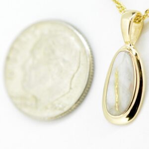 The pendant features a natural gemstone known as “Gold Bearing Quartz,” typically mined from deep underground. In most cases, gold found in quartz exists in microscopic amounts, making it virtually invisible. However, this pendant boasts an extraordinary rarity as it showcases a very scarce stone that is first cut into slabs, revealing the precious gold vein. Subsequently, a skilled artisan cuts, shapes, polishes, and mounts it into a 14k gold setting. Embrace the allure of this remarkable Gold Bearing Quartz pendant and celebrate the natural beauty of this exceptional gemstone.