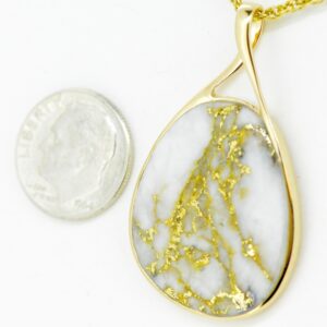 The pendant features a natural gemstone known as “Gold Bearing Quartz,” typically mined from deep underground. In most cases, gold found in quartz exists in microscopic amounts, making it virtually invisible. However, this pendant boasts an extraordinary rarity as it showcases a very scarce stone that is first cut into slabs, revealing the precious gold vein. Subsequently, skilled artisans cut, shape, polish, and mount it into a 14k gold setting. Embrace the allure of this remarkable Gold Bearing Quartz pendant and celebrate the natural beauty of this exceptional gemstone.