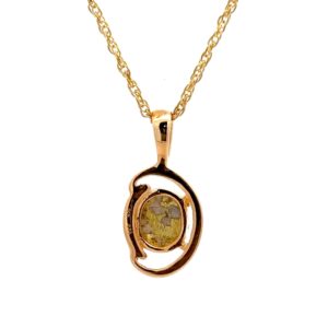The pendant features a natural gemstone known as “Gold Bearing Quartz,” typically mined from deep underground. In most cases, gold found in quartz exists in microscopic amounts, making it virtually invisible. However, this pendant boasts an extraordinary rarity as it showcases a very scarce stone that is first cut into slabs, revealing the precious gold vein. Subsequently, skilled artisans cut, shape, polish, and mount it into a 14k gold setting. Embrace the allure of this remarkable Gold Bearing Quartz pendant and celebrate the natural beauty of this exceptional gemstone.