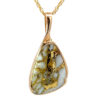 The pendant features a natural gemstone known as “Gold Bearing Quartz,” typically mined from deep underground. In most cases, gold found in quartz exists in microscopic amounts, making it virtually invisible. However, this pendant boasts an extraordinary rarity as it showcases a very scarce stone that is first cut into slabs, revealing the precious gold vein. Subsequently, it is skillfully cut, shaped, polished, and mounted into a 14k gold setting. Embrace the allure of this remarkable Gold Bearing Quartz pendant and celebrate the natural beauty of this exceptional gemstone.