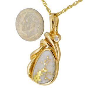 The pendant features a natural gemstone known as “Gold Bearing Quartz,” typically mined from deep underground. In most cases, gold found in quartz exists in microscopic amounts, making it virtually invisible. However, this pendant boasts an extraordinary rarity as it showcases a very scarce stone that is first cut into slabs, revealing the precious gold vein. Subsequently, skilled artisans cut, shape, polish, and mount it into a 14k gold setting. Embrace the allure of this remarkable Gold Bearing Quartz pendant and celebrate the natural beauty of this exceptional gemstone.