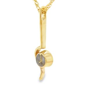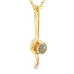 The pendant features a natural gemstone known as “Gold Bearing Quartz,” typically mined from deep underground. In most cases, gold found in quartz exists in microscopic amounts, making it virtually invisible. However, this pendant boasts an extraordinary rarity as it showcases a very scarce stone that is first cut into slabs, revealing the precious gold vein. Skilled artisans cut, shape, polish, and mount the gold quartz into a 14k gold setting. Embrace the allure of this remarkable Gold Bearing Quartz pendant and celebrate the natural beauty of this exceptional gemstone.