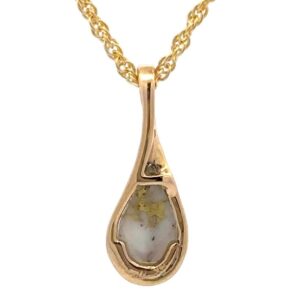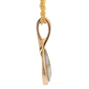 The pendant features a natural gemstone known as “Gold Bearing Quartz,” typically mined from deep underground. In most cases, gold found in quartz exists in microscopic amounts, making it virtually invisible. However, this pendant boasts an extraordinary rarity as it showcases a very scarce stone that is first cut into slabs, revealing the precious gold vein. Subsequently, skilled artisans cut, shape, polish, and mount it into a 14k gold setting. Embrace the allure of this remarkable Gold Bearing Quartz pendant and celebrate the natural beauty of this exceptional gemstone.