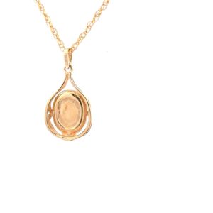 This is an oval-shaped pendant made of gold quartz set in a unique 14k yellow gold setting and comes with a 14k gold-plated chain. It is about 1 inch tall overall. The smooth, polished surface brilliantly reflects light, capturing attention from every angle. The photos showcase enlarged details of this beautiful piece.