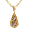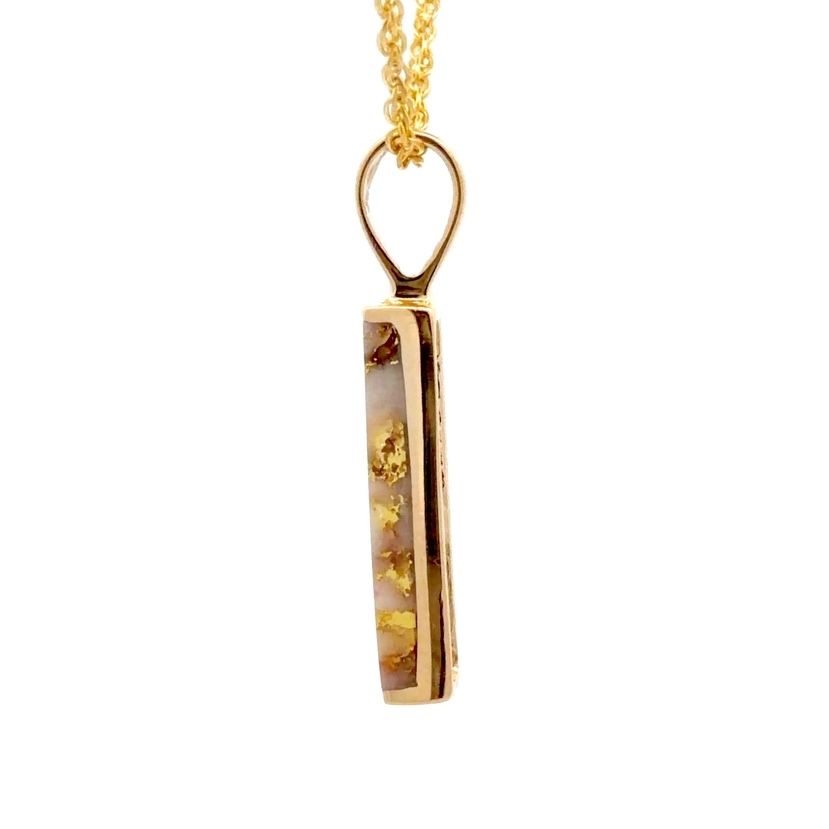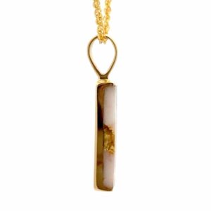 The pendant features a natural gemstone known as “Gold Bearing Quartz,” typically mined from deep underground. In most cases, gold found in quartz exists in microscopic amounts, making it virtually invisible. However, this pendant boasts an extraordinary rarity as it showcases a very scarce stone that is first cut into slabs, revealing the precious gold vein. Subsequently, skilled artisans cut, shape, polish, and mount it into a 14k gold setting. Embrace the allure of this remarkable Gold Bearing Quartz pendant and celebrate the natural beauty of this exceptional gemstone.