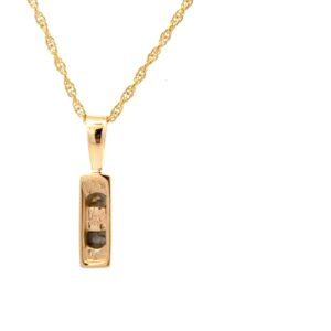 This is a rectangle-shaped pendant made of gold quartz set in a solid 14k yellow gold setting and comes with a 14k gold-plated chain. The smooth, polished surface brilliantly reflects light, capturing attention from every angle. The photos showcase enlarged details of this beautiful piece.