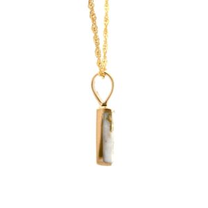 The pendant features a natural gemstone known as “Gold Bearing Quartz,” typically mined from deep underground. In most cases, gold found in quartz exists in microscopic amounts, making it virtually invisible. However, this pendant boasts an extraordinary rarity as it showcases a very scarce stone that is first cut into slabs, revealing the precious gold vein. Subsequently, skilled artisans cut, shape, polish, and mount it into a 14k gold setting. Embrace the allure of this remarkable Gold Bearing Quartz pendant and celebrate the natural beauty of this exceptional gemstone.