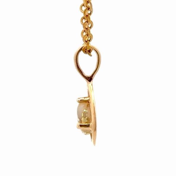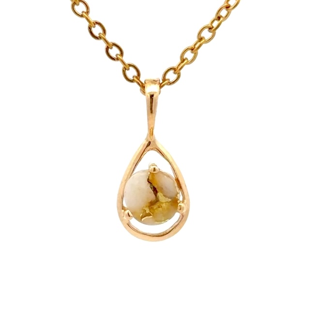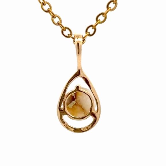 This is a teardrop pendant made of gold quartz set in a 14k yellow gold setting with a halo of gold nuggets and comes with an 18″14k gold plated chain. The smooth, polished surface brilliantly reflects light, capturing attention from every angle. The photos showcase enlarged details of this beautiful piece.
