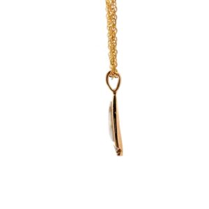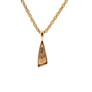 The pendant features a natural gemstone known as “Gold Bearing Quartz,” typically mined from deep underground. In most cases, gold found in quartz exists in microscopic amounts, making it virtually invisible. However, this pendant boasts an extraordinary rarity as it showcases a very scarce stone that is first cut into slabs, revealing the precious gold vein. Subsequently, skilled artisans cut, shape, polish, and mount it into a 14k gold setting. Embrace the allure of this remarkable Gold Bearing Quartz pendant and celebrate the natural beauty of this exceptional gemstone.