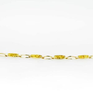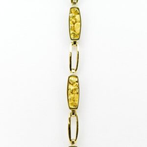This gold nugget bracelet is 7 inches long and weighs 8.7 dwt. The mounting is 14k gold with natural Alaskan gold nuggets.