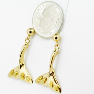 These 14k whale tail shaped earrings have natural gold nuggets soldered to them. Gold nuggets make very interesting, one of a kind jewelry. They will definitely be conversation starters. Because the nuggets are natural, the nugget shapes will vary. The photo shown is a sample piece. It comes with a silver plated chain and mounted in a gift box. Photos are enlarged to display detail.