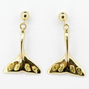 These 14k whale tail shaped earrings have natural gold nuggets soldered to them. Gold nuggets make very interesting, one of a kind jewelry. They will definitely be conversation starters. Because the nuggets are natural, the nugget shapes will vary. The photo shown is a sample piece. It comes with a silver plated chain and mounted in a gift box. Photos are enlarged to display detail.