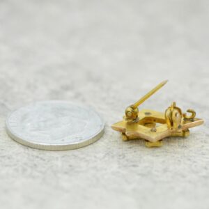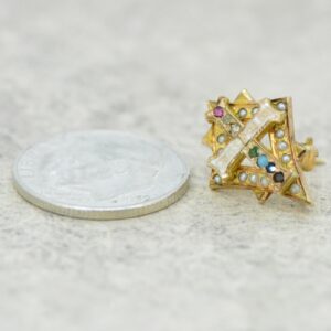 Specs: This rainbow girls pin is made with 10k gold and has a total weight of 1.1 dwt. It is delicately detailed with seed pearls and lab grown gems. The inscription across the front reads “Cross of Color”.