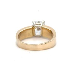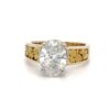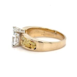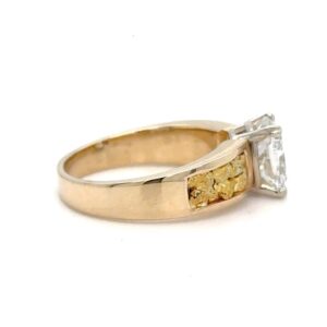This 2.16ct lab-grown diamond lady’s ring is crafted from 14k yellow gold. The ring features natural Alaskan gold nuggets and a 2.16-carat lab-grown center diamond, with clarity VS2 and color F, mounted in a nice 4-prong setting that is very strong and secure. This handmade ring weighs 6.7 grams. Ring Size: 7.25.